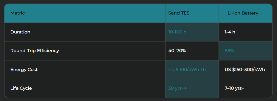 The Enduring system separates inexpensive silica-sand storage from power-cycle hardware, enabling economical scaling beyond 100 hours without the geographic limits of pumped hydro or compressed-air plants.