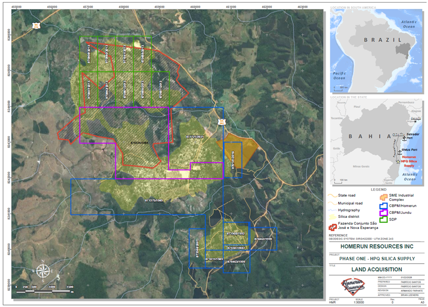 - Purchase of 582-hectare Fazenda Conjunto São José e Nova Esperança in the Santa Maria Eterna (SME) Silica Sand District, directly adjacent to Homerun’s recently secured 64-hectares of surface rights targeted for the Company’s silica processing and solar glass industrial complex. (see press release dated December 15, 2025).